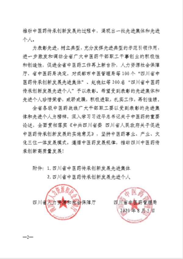 為表彰先進,樹立典型,充分發揮先進典型的示范引領作用, 進一步激發和調動全省廣大中醫藥干部職工干事創業的積極性和創造性,促進全省中醫藥工作再上新臺階,人力資源社會保障廳、省中醫藥局決定,對成都市中醫管理局等 100 個“四川省中醫藥傳承創新發展先進集體”、趙曉紅等 200 名“四川省中醫藥傳承創新發展先進個人”予以表彰。希望受到表彰的先進集體和先進個人珍惜榮譽,戒驕戒躁,積極進取,扎實工作,再創佳績。