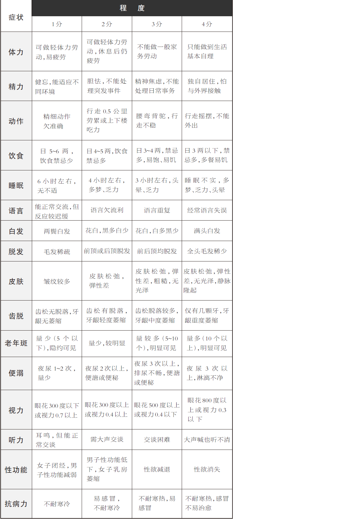 衰老會帶來一系列變化,準確判斷自己的衰老程度,能讓老人更安全、有效、科學地健身,從而達到延緩衰老、增加活力的目的。本書中的表格共有16項指標,通過評估老人的肌肉力量、皮膚狀態、平衡能力、心肺功能、認知能力等方面,將衰老程度量化為具體分數,由輕到重分為1~4分,總分最高是64分。老人自測時,可將自己的情況與表中的描述一一對應,并進行打分。若總分達30分以上,則表明身體已進入老年期,總分越高衰老程度越重。